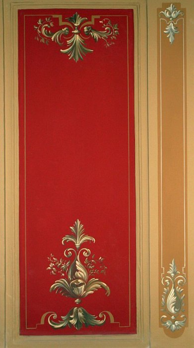 Neben der Rekonstruktion der Lünettenbilder (auf Lainwand) über den Scheintüren (Holzimitation), wurden auch die Kassettierungen in historistischer Ausmalung rekonstruiert.